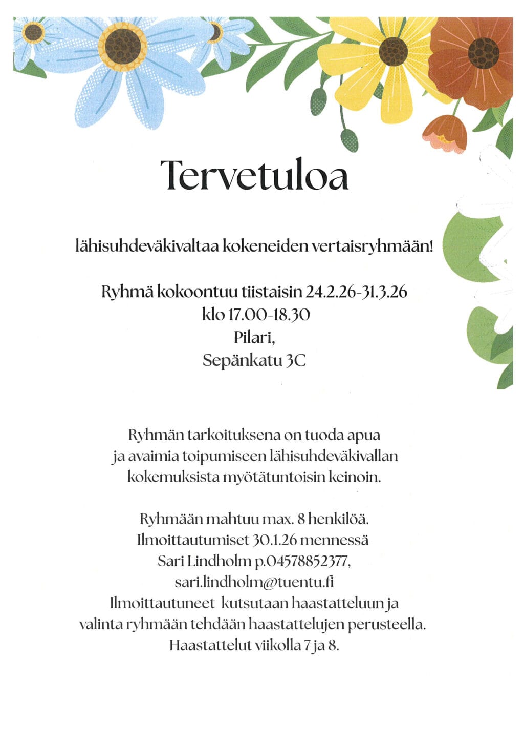 Tule mukaan lähisuhdeväkivaltaa kokeneiden vertaisryhmä keväällä 2026!